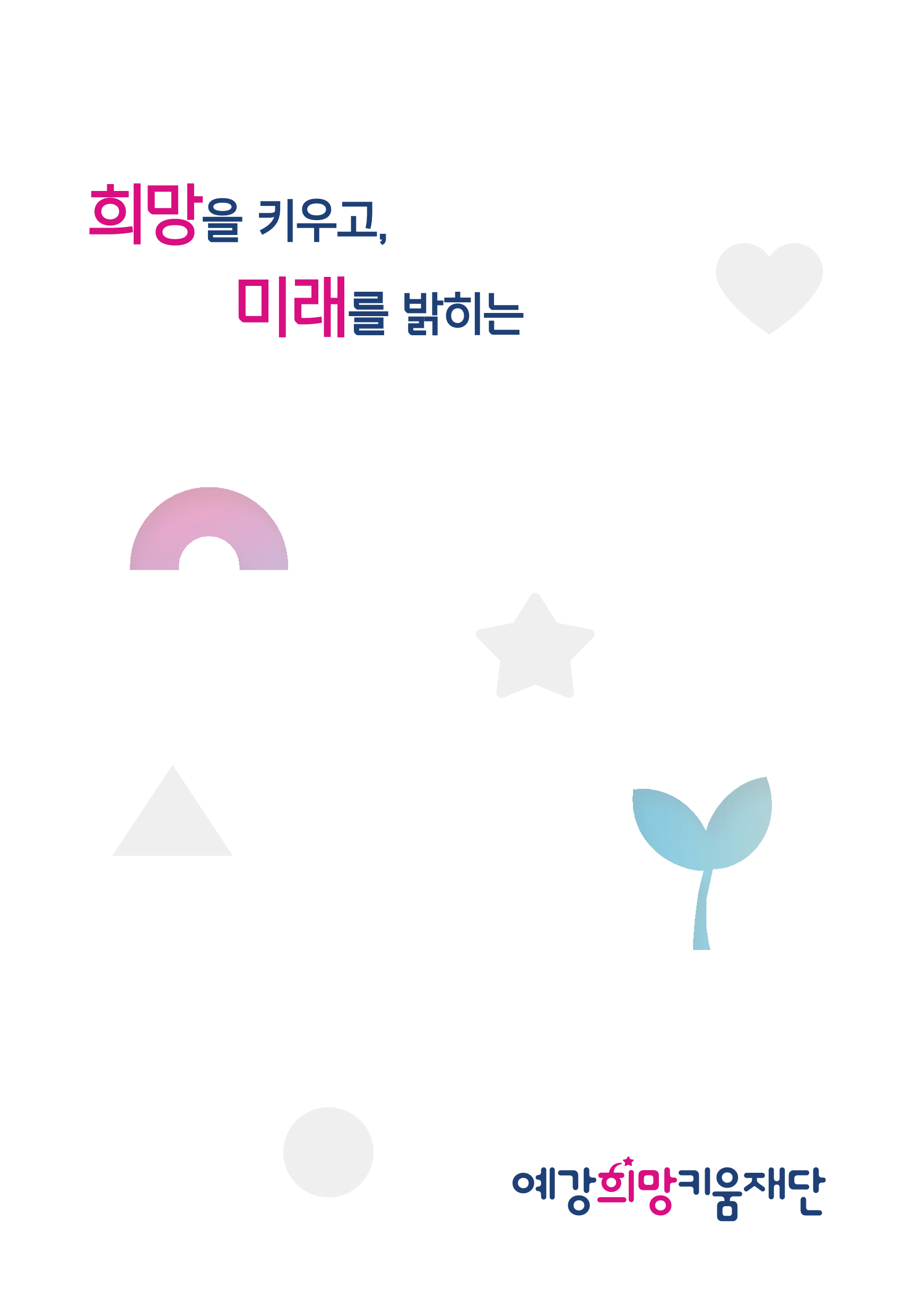 안녕하십니까. 예강희망키움재단 사무국입니다. 예강희망키움재단은 다우키움그룹 창업주 김익래 전 회장이 사회 환원을 위해 설립한 사회공헌재단입니다. 비온 뒤 하늘의 쌍무지개를 의미하는 예강霓岡처럼 '나눔으로 희망을 키우고 따뜻하게 성장할 수 있는 사회'를 미션으로 삼고, 취약계층이 공정한 기회를 누리며 건강한 환경에서 성장할 수 있도록 지속 가능한 지원을 펼치고 있습니다. 이번에 발행된 재단 공식 리플릿에는 재단의 설립 취지, 핵심 사업, 운영 방향 등이 담겨 있습니다. ‘따뜻한 희망 플랫폼’으로 성장할 수 있도록 최선을 다하겠습니다. 많은 관심과 격려 부탁드립니다.