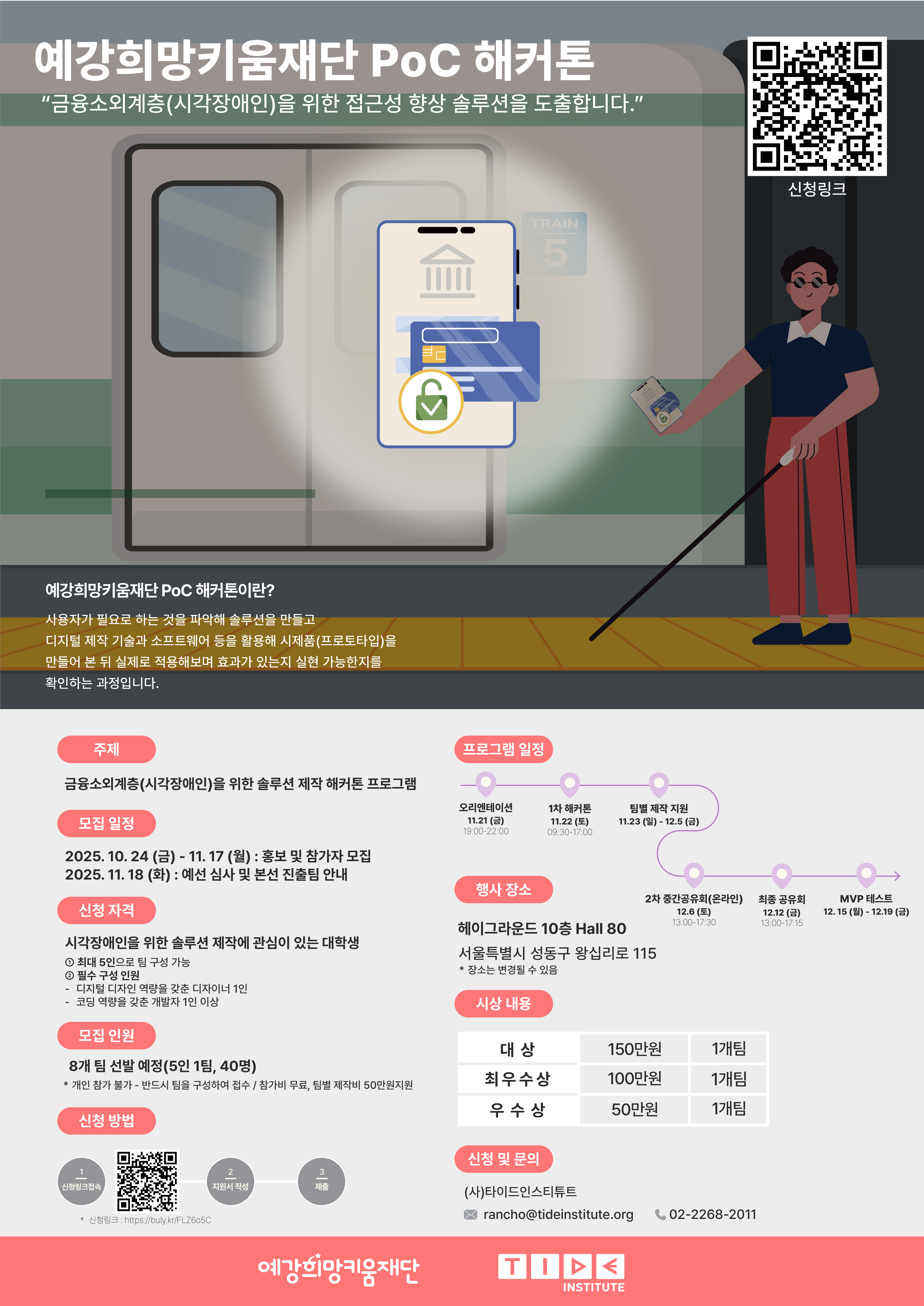 안녕하십니까. 예강희망키움재단 사무국입니다.예강희망키움재단에서 주최하는 PoC(Proof of Concept) 프로그램은 '금융 소외계층인, 시각장애인을 위한 접근성 향상 솔루션 개발'을 주제로 진행되는 실증형 메이킹 프로젝트입니다. PoC는 ‘Proof of Concept’의 약자로, 아이디어의 실현 가능성을 검증하고 실제 사용자 중심의 시제품(MVP)을 제작하는 과정을 뜻합니다. 디자이너, 개발자, 기획자 등 다양한 분야의 참가자들이 팀을 이루어 약 4주간 아이디어 발굴부터 프로토타입 제작, 실사용자 테스트까지 진행합니다. 아이디어를 현실로, 금융 접근성을 혁신하는 여정에 함께하세요!예강희망키움재단 PoC 프로그램이 여러분의 첫 실증 프로젝트를 기다립니다.자세한 내용은 아래 배너를 통해 확인해주세요.