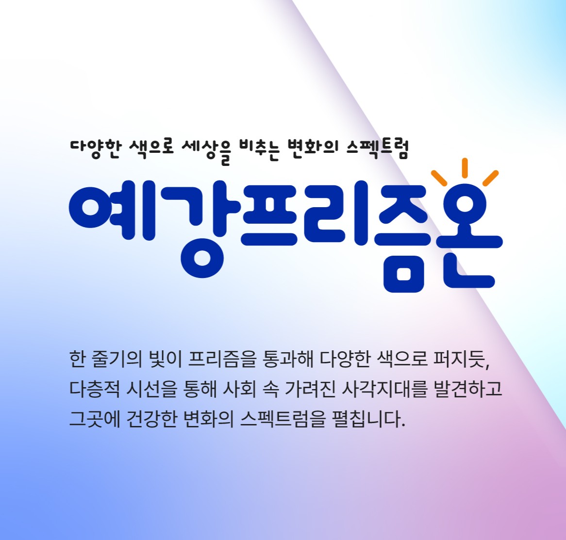 안녕하십니까. 예강희망키움재단 사무국입니다. 예강희망키움재단은 다음세대재단과 함께 '예강프리즘온(PRISM:ON)' 사업을 론칭했습니다.예강프리즘온(PRISM:ON)은 사회적 관심과 지원이 부족한 복지 사각지대를 조명하고, 당사자 수요에 기반해 다양한 프로그램, 서비스 등을 입체적으로 제공하여 신체적・정서적・사회적 건강 증진을 위한 통합적 지원 체계를 구축하는 사업입니다.2025 예강프리즘온은 경계선 지능 아동과 해당 가정을 대상으로 아동의 신체적 건강 및 사회적 기능 향상과 양육자의 정서적 건강을 지원합니다.예강프리즘온은 새로운 방식으로 사회문제를 해결하는 다양한 비영리스타트업 및 현장의 파트너와 함께하고 있습니다.자세한 내용은 '예강프리즘온 홈페이지( https://yegangprismon.org )'를 참고해주세요.