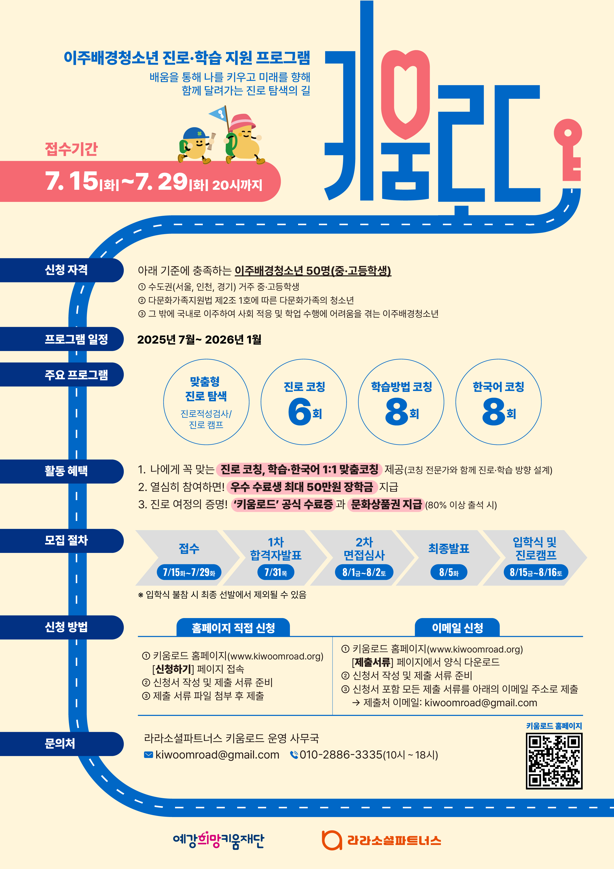 『키움로드』는 이주배경청소년이 사회적지지 자원을 확보하여 자신의 강점, 꿈을 바탕으로 구체적인 진로를 설정하도록 하고 진로를 구체화하기 위한 학습 방법을 체득하도록 지원하는 진로 설계 프로그램입니다. 『키움로드』와 함께 길을 걷고 꿈을 이루고 싶은 이주배경청소년의 많은 관심과 신청 바랍니다.자세한 내용은 '키움로드 홈페이지( www.kiwoomroad.org )'를 참고해주세요.