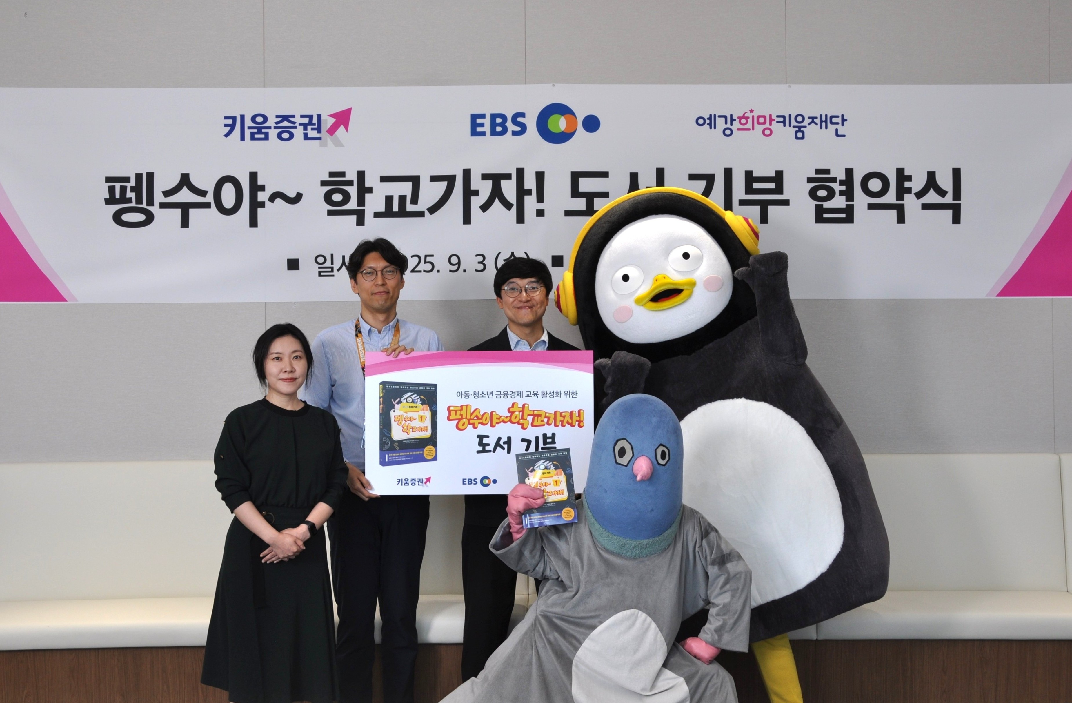 예강희망키움재단이 지난 3일 서울 여의도 키움증권 본사에서 키움증권과 한국교육방송공사(EBS), 출판사 넥스트씨와 함께 ‘펭수야~ 학교가자!’ 도서 기부 업무협약(MOU)을 체결했다고 4일 밝혔다.협약은 아동·청소년이 쉽고 재미있게 금융과 경제를 배우도록 지원하고 취약계층 아동·청소년의 금융 문해력 향상과 경제적 자립을 돕기 위해 마련됐다.협약에 따라 키움증권과 EBS는 도서 판매에 따른 인세를 예강희망키움재단에 기부하며 합본 세트(1~3권) 1000세트를 전국 250개 아동·청소년 복지시설에 전달한다. 넥스트씨도 도서가 아동·청소년들에게 원활히 전달될 수 있도록 협력한다.예강희망키움재단 관계자는 “아이들에게 경제를 재미있게 배울 기회를 제공할 수 있는 도서를 전달할 수 있게 되어 뜻깊게 생각한다”며 “앞으로도 다양한 사회공헌 활동을 통해 아동·청소년의 미래를 응원하겠다”고 말했다.재단은 기부받은 인세 전액을 취약계층의 아동·청소년의 교육과 복지 그리고 신체적·정서적 건강한 성장을 지원하는 사업에 사용할 계획이다. (출처 : https://www.viva100.com/article/20250904500383 )