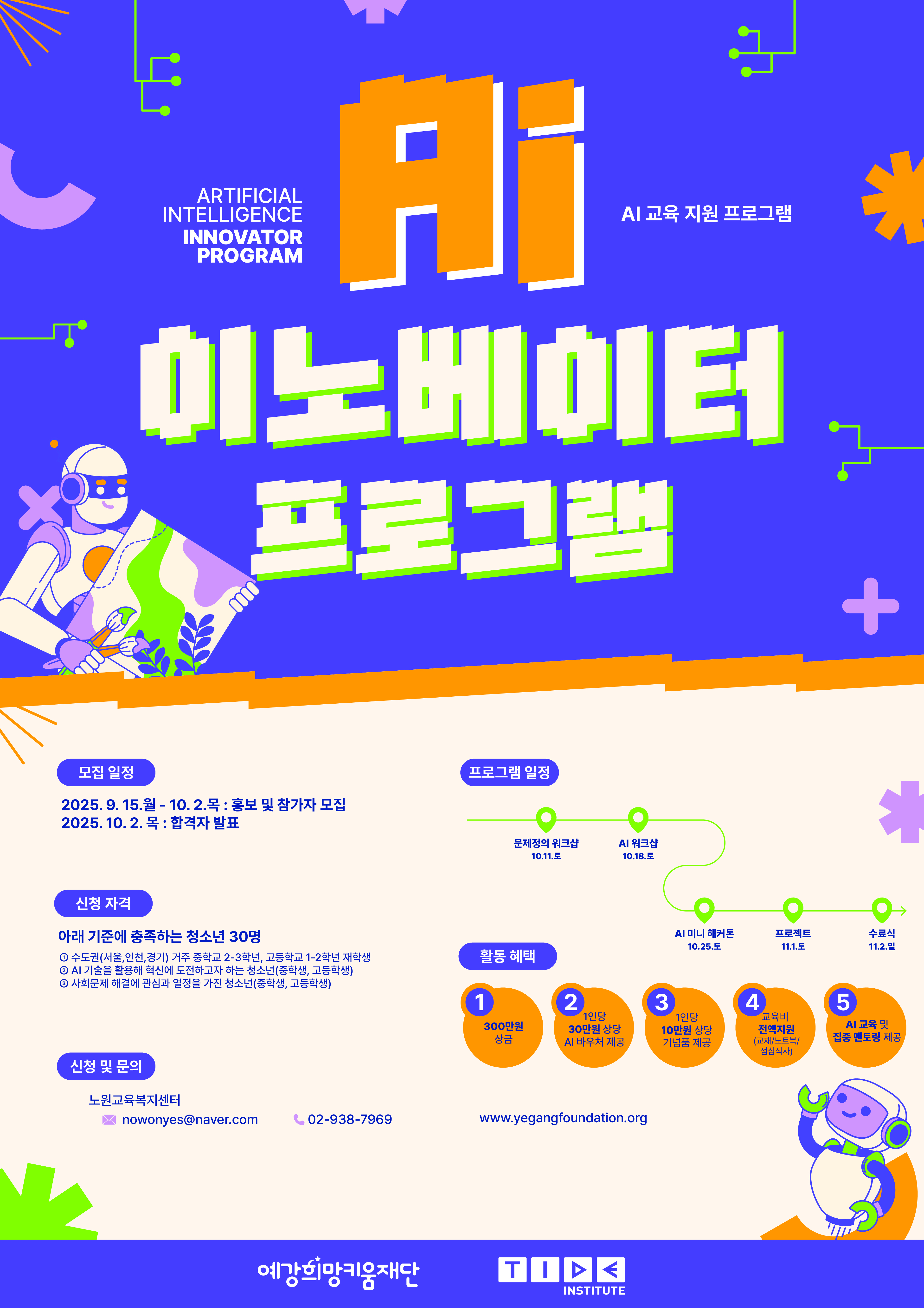 안녕하십니까. 예강희망키움재단 사무국입니다.AI 기술은 우리 삶을 빠르게 변화시키고 있습니다. 하지만 누구나 그 기회를 누리는 것은 아닙니다.AI 이노베이터 프로그램은 취약계층 청소년(중·고등학생)을 대상으로, AI·디지털 기술에 대한 교육과 실습 기회를 제공합니다.3주(6회기) 단기 과정을 통해 AI 이노베이터 프로그램에서 여러분의 잠재력을 발견하세요 :-D*참가자 전원에게는 AI바우처, 전문 교육과 멘토링, 프로젝트 기회가 제공됩니다.자세한 내용은 아래 배너를 통해 확인해주세요.